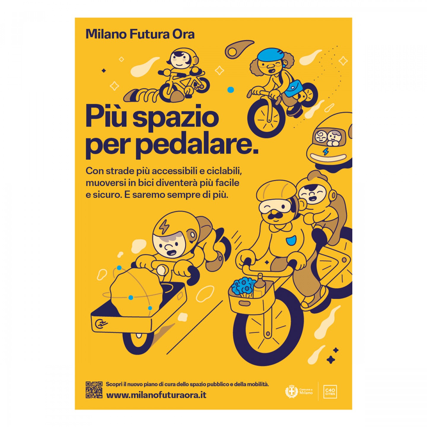 "Conquistiamo il nostro spazio" (i.e. "Let’s Take Back Our Space") is a campaign created with C40 Cities and the Municipality of Milan to raise awareness about shared public space and to promote active mobility, such as walking, cycling, and using public transport, to improve air quality and the livability of the city, with particular focus on children and the elderly.