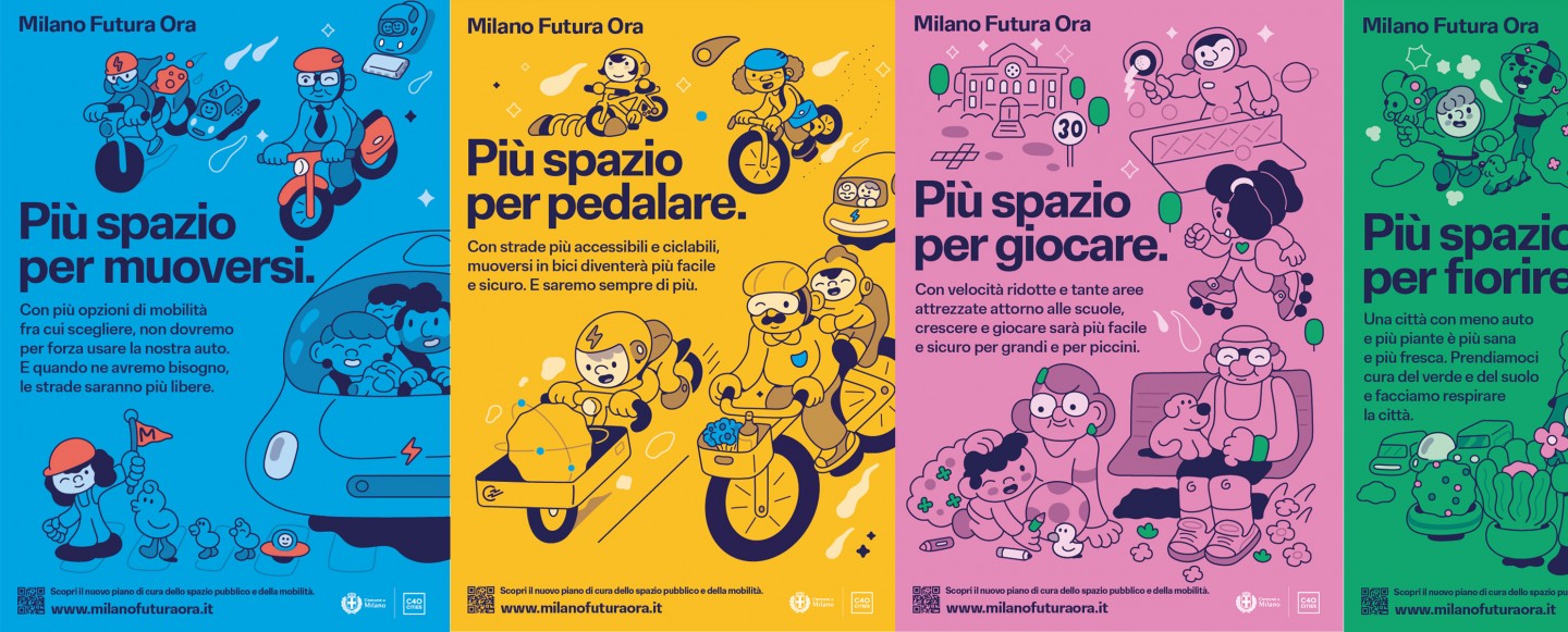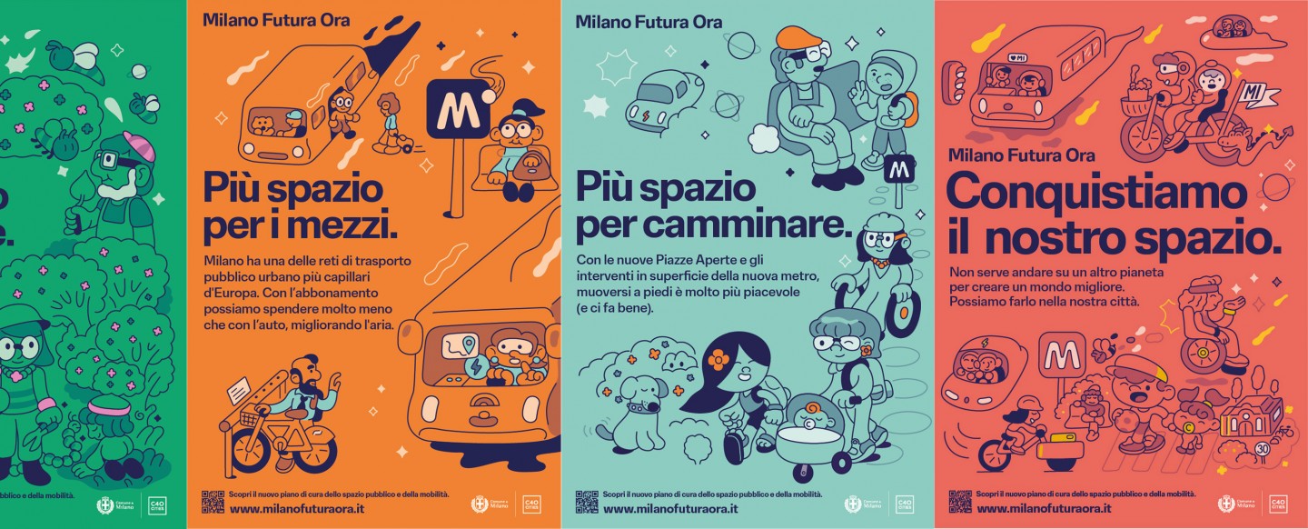 OOH campaign and website on shared public spaces and active mobility in Milan.