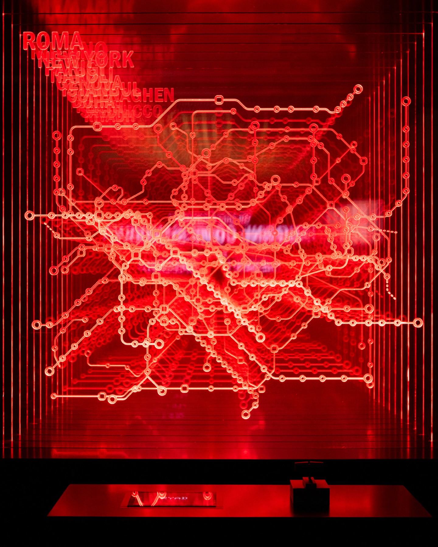 The Interactive Metro: subway lines displayed on illuminated plexiglass panels demonstrate how cities evolved and connected across time.