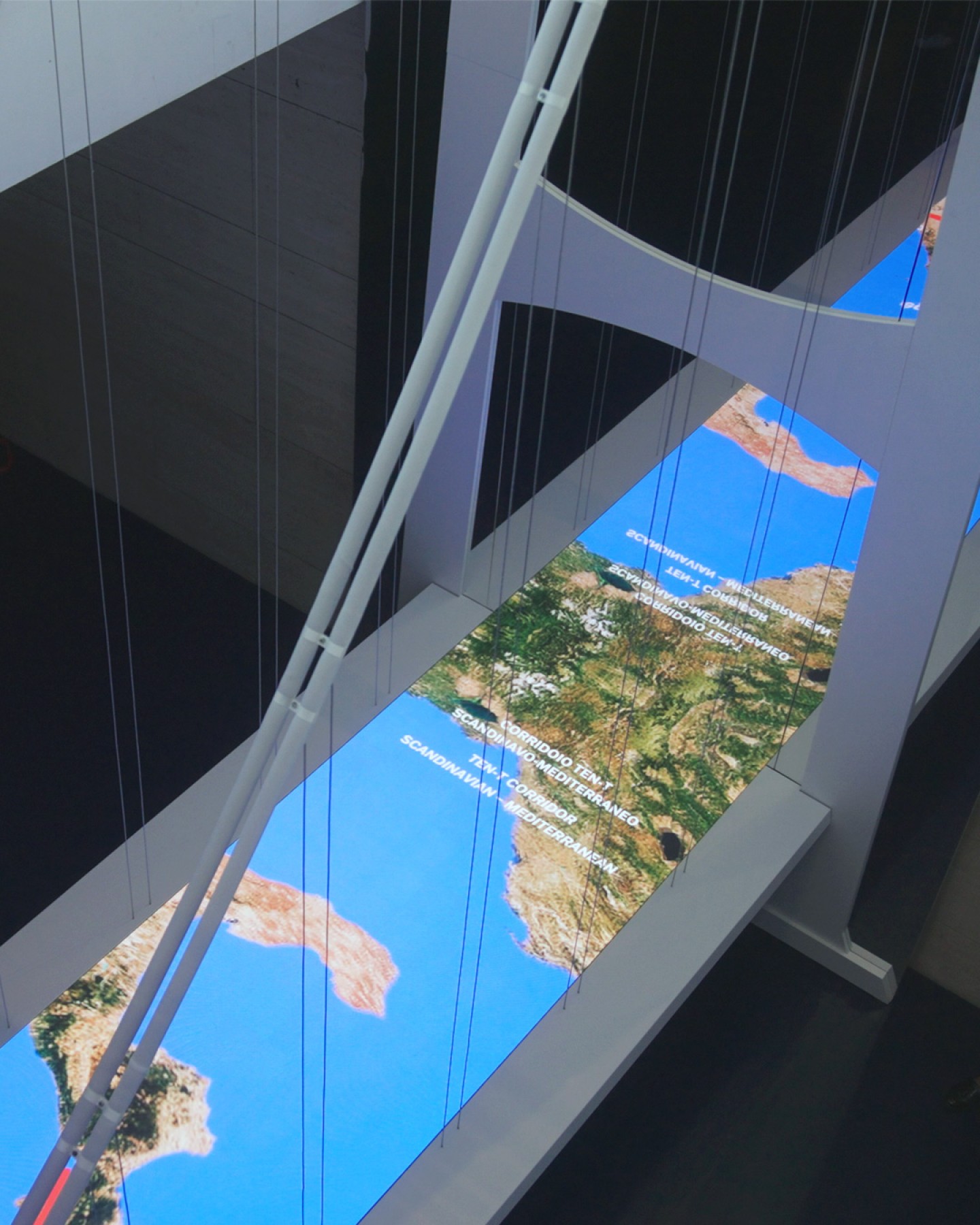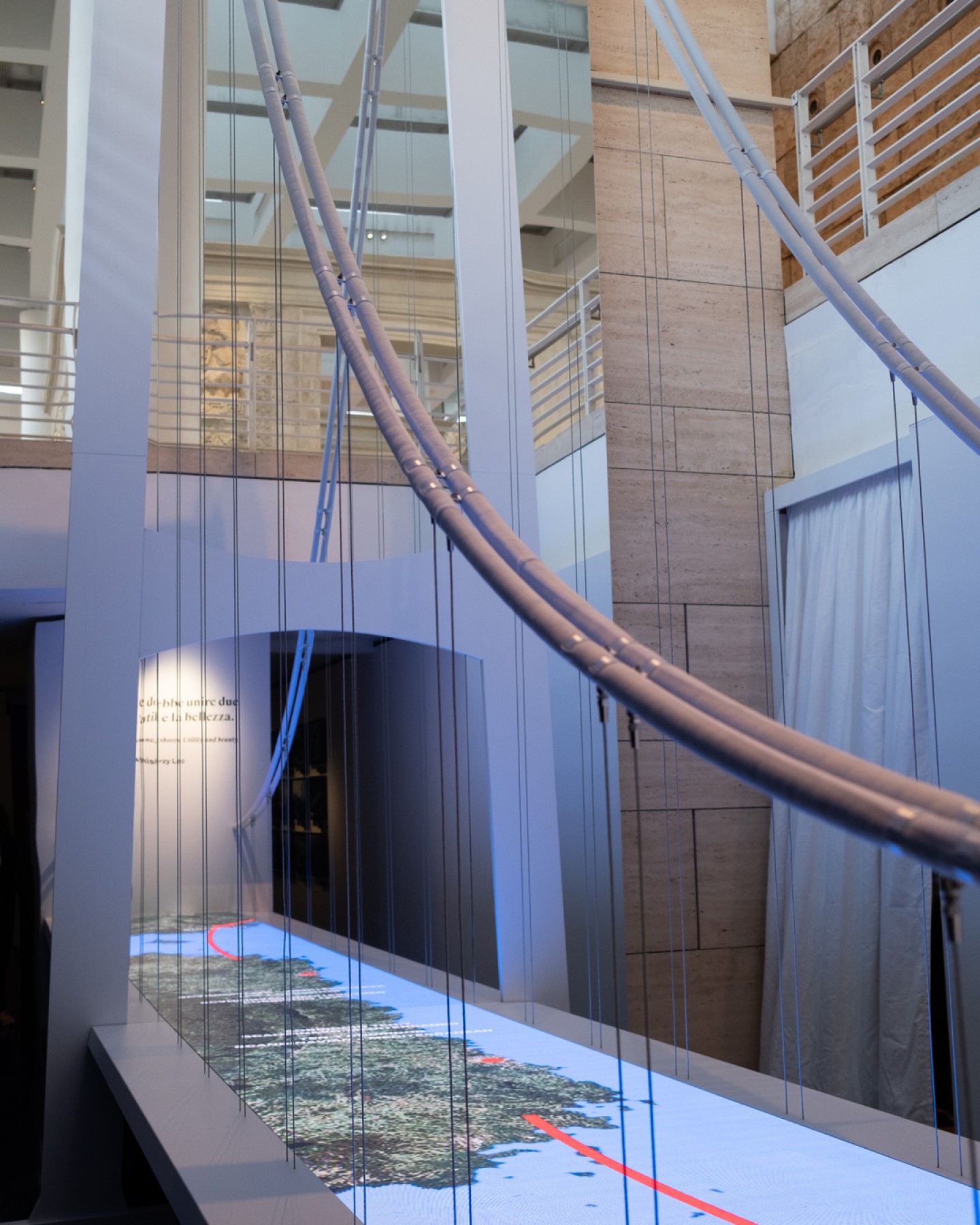 The journey culminates in the meta-bridge, a scenographic model of the Strait of Messina Bridge, creating a visual and symbolic link between the exhibition and the Ara Pacis.