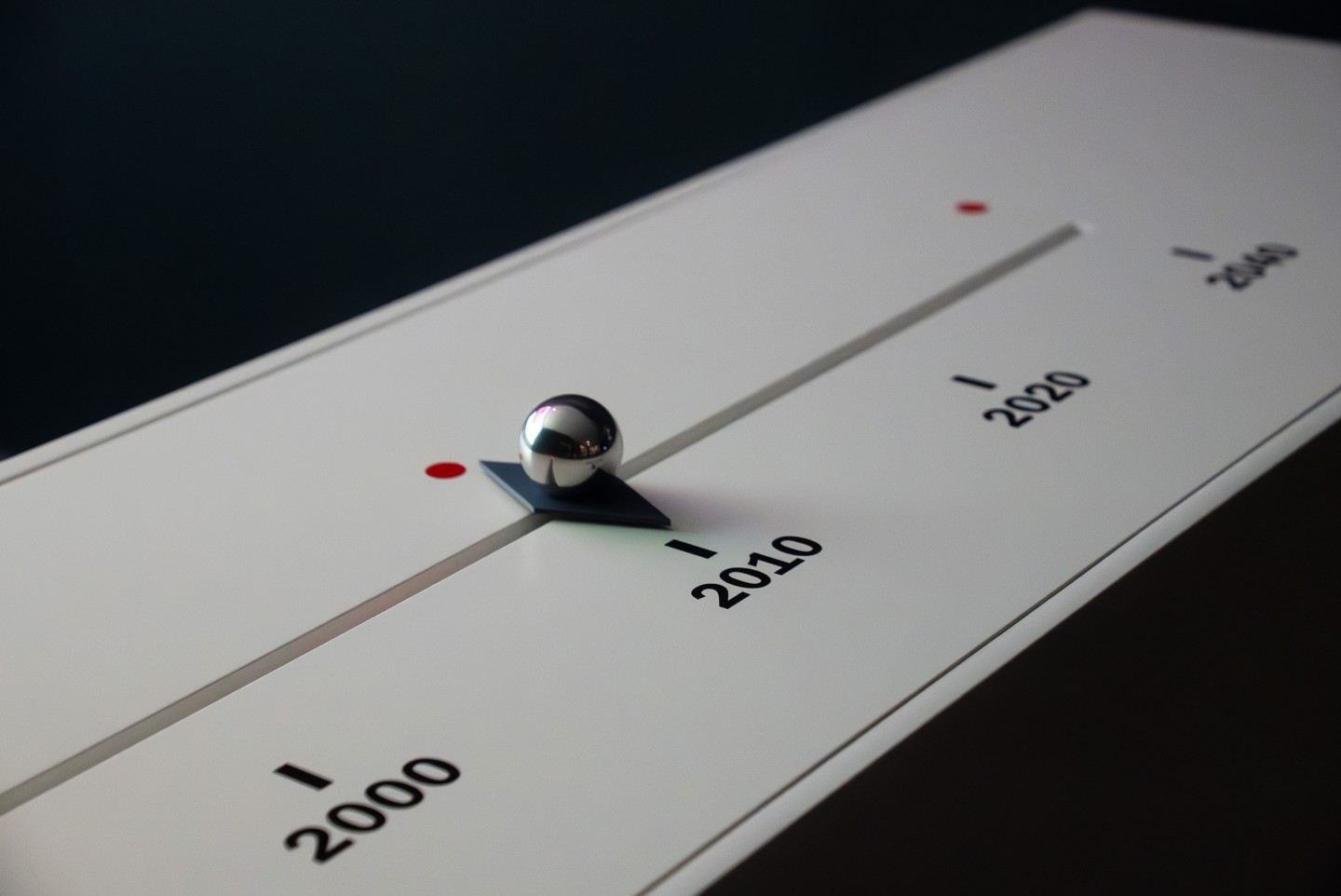 The Distance Dashboard: by turning a knob along a timeline, visitors see how travel times between locations shrink — distances measured not in kilometers but in hours — making the impact of infrastructure tangible.
